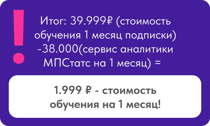 Вы платите за обучение 39.999₽ и получаете подписку на сервис аналитики MPStats стоимостью в 38.000 абсолютно бесплатно!